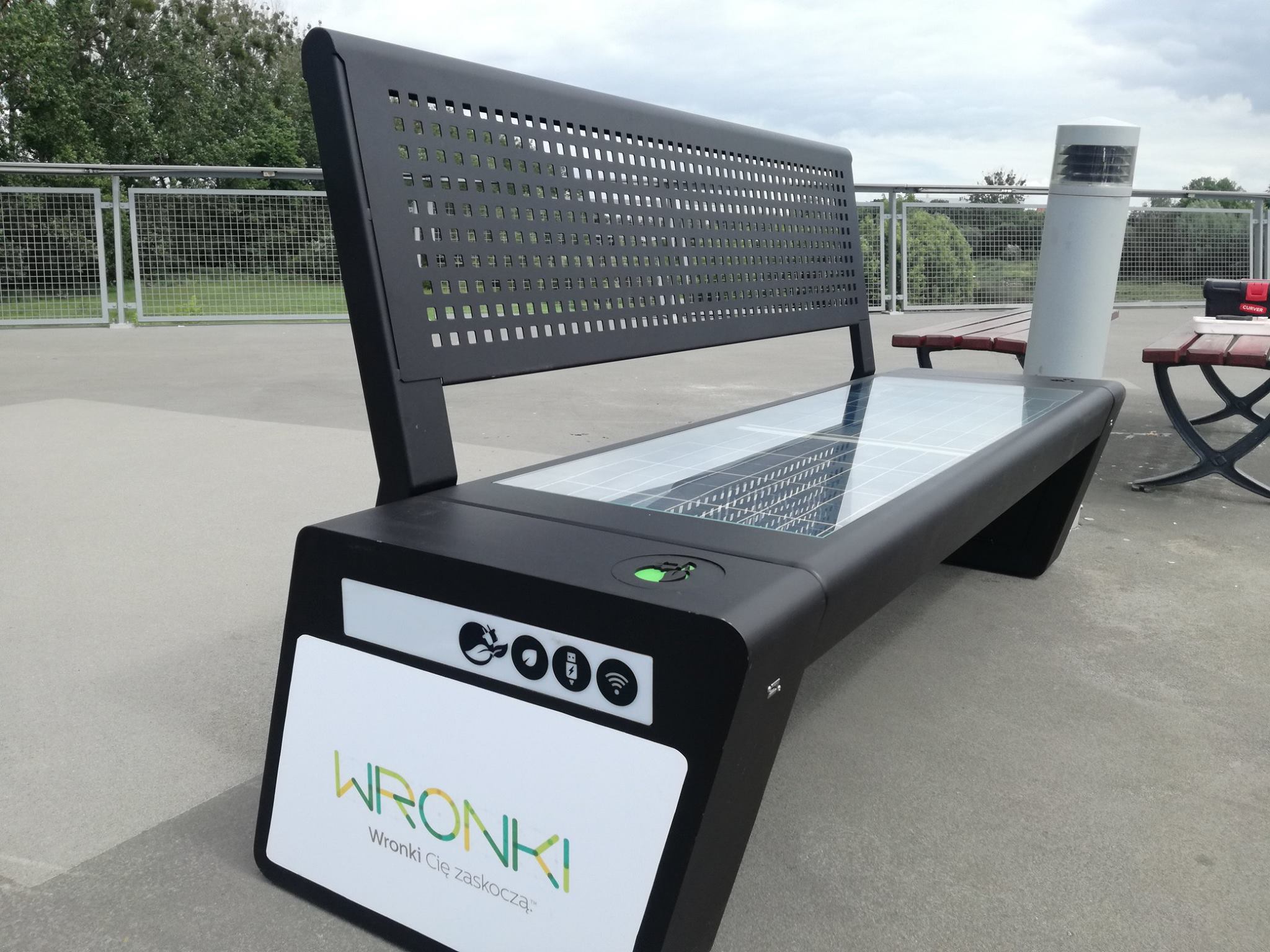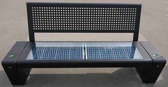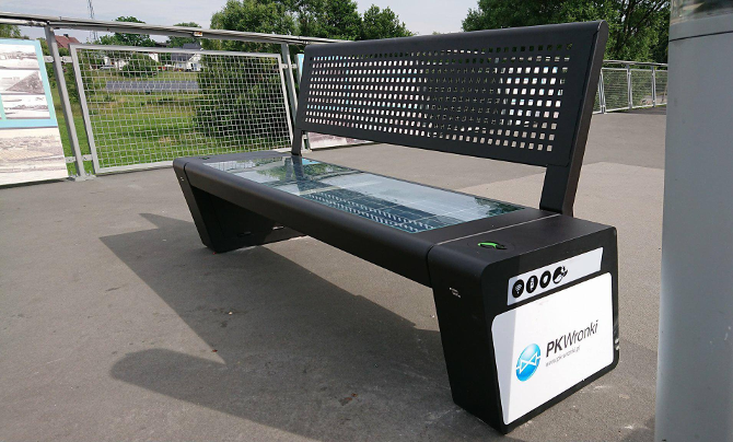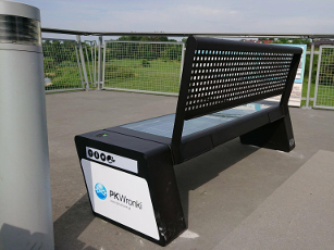 Our latest initiative is the installation of a solar bench on a footbridge. Solar panels are used to power it. Thanks to the accumulated energy, you can charge a telephone via USB – 24 hours a day. The power of the panels is 120 W and the battery capacity is 30 Ah. Working time without the Sun – 5 days. It is made of steel and tempered glass.