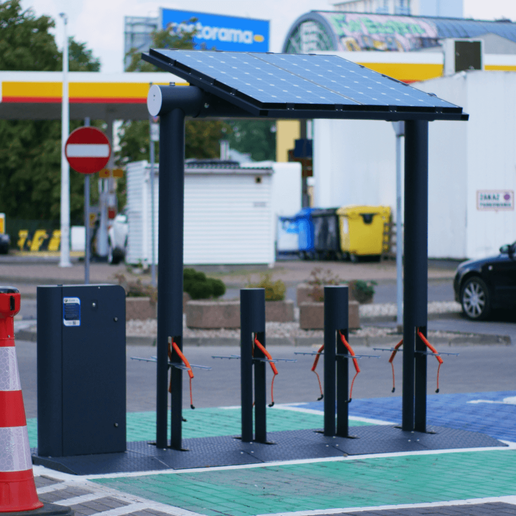The station offers 8 slots for parking and eco-friendly charging with the energy provided by the sun with the help of solar panels and a central unit that actively manages the energy running through the system. The station operates entirely self-sufficiently, incorporating advanced algorithms to guarantee a constant energy supply for charging purposes.
